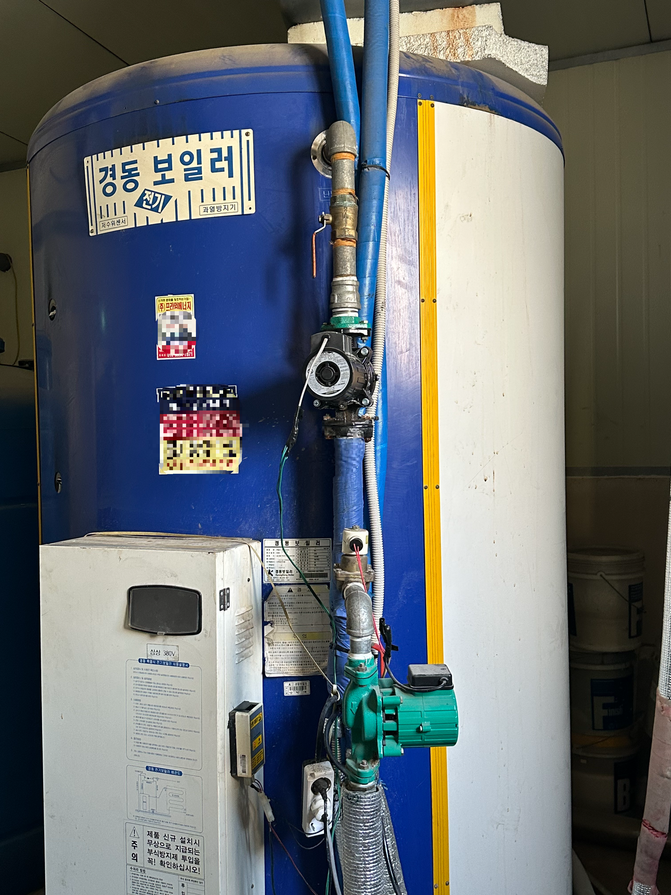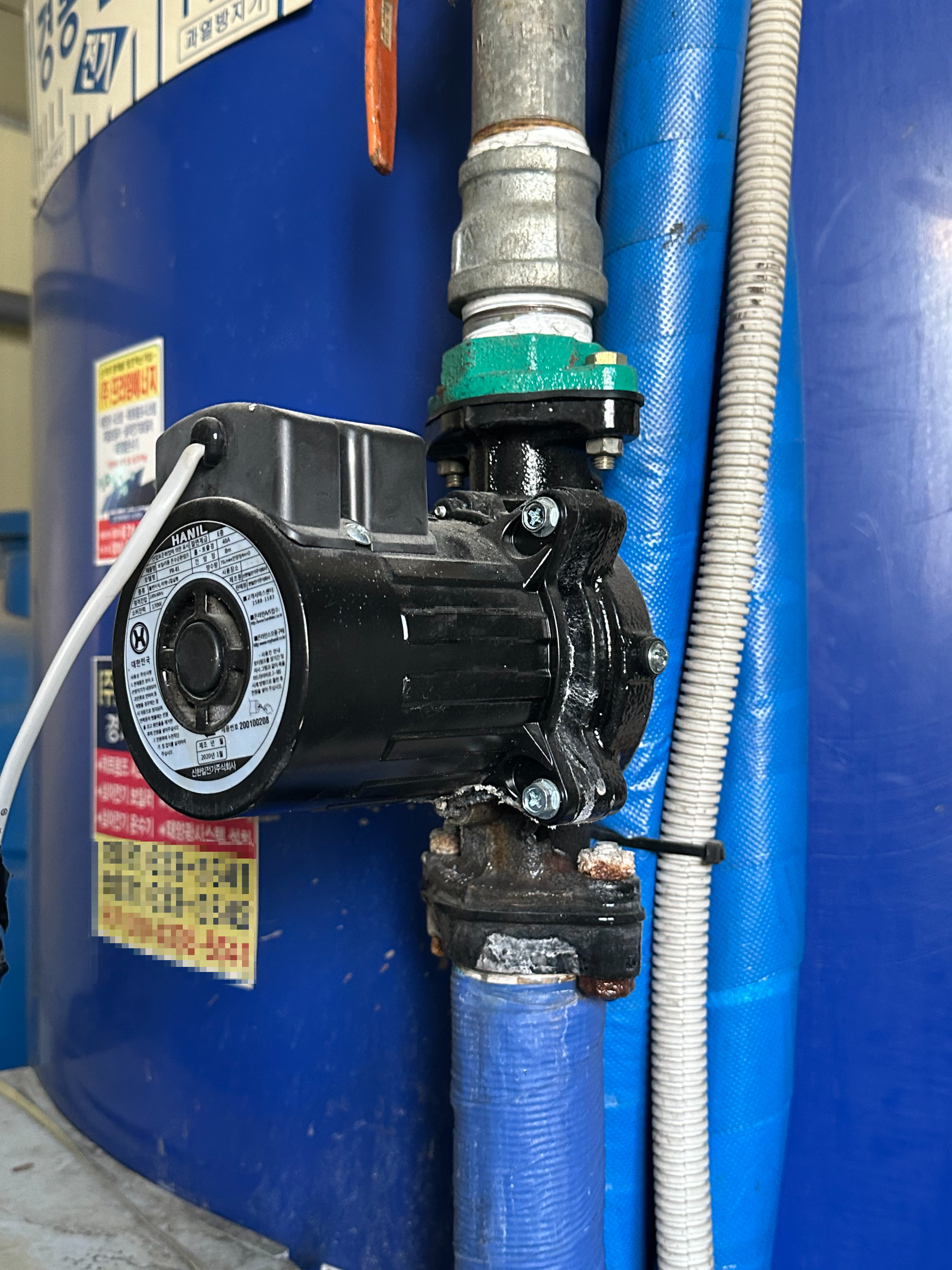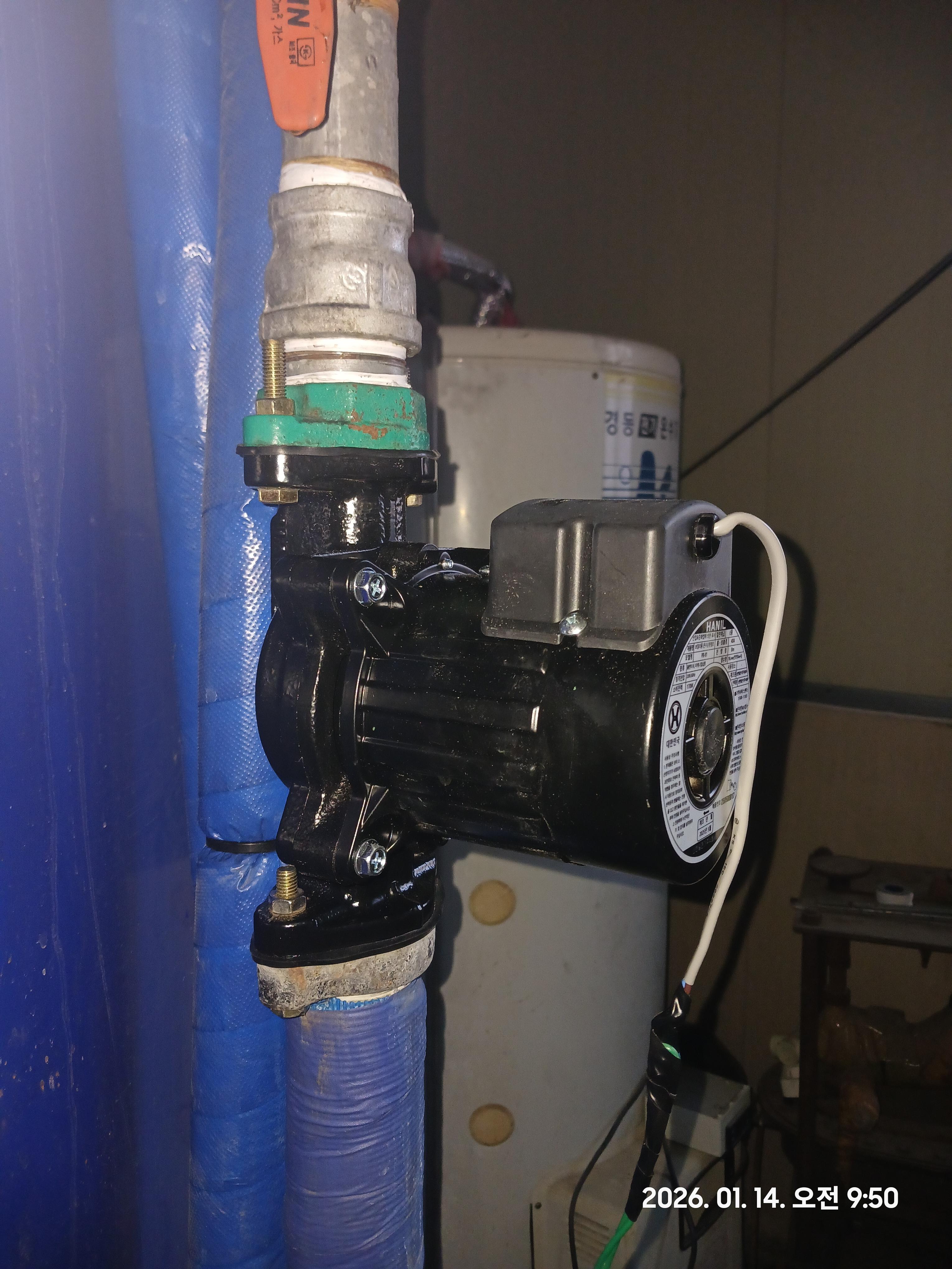 작업 내용 기존에 장착되어 있던 노후 펌프를 제거하고, 경동 심야전기보일러 규격에 맞는 한일 40A 신형 순환펌프 교체를 진행했습니다.