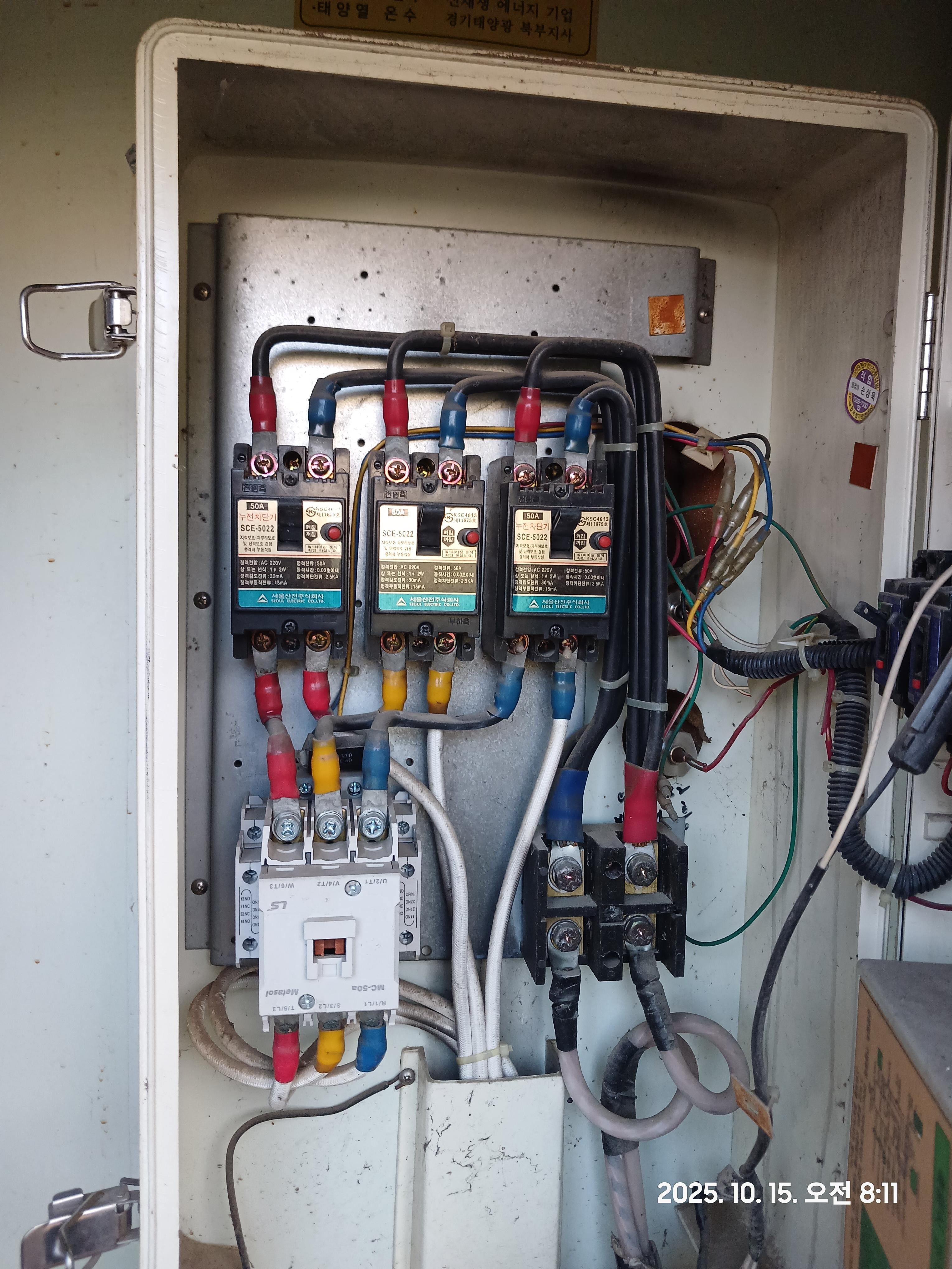 아래는 교체 전 노후된 기존 제어반 내부 모습입니다. 복잡한 배선과 노후된 부품들을 확인할 수 있습니다.
